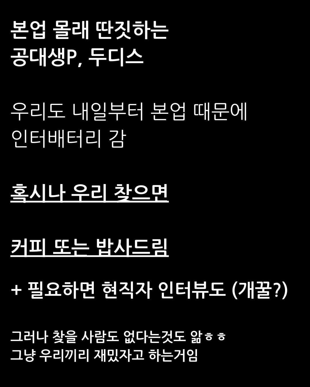 1️⃣ 행사장에서 공대생P 또는 두디스를 찾는다. (피드 인상착의 참고!)